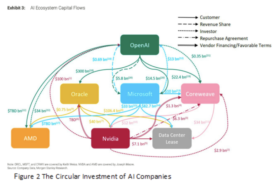 The beauty of the American economy is that we are not spectators to this revolution. In fact, we are active participants through the deployment of capital. We can choose where to invest based on where we believe the greatest return on our investment lies for the future. Thus far, gains have been concentrated at the top of the S&P 500. NVIDIA has been the AI bellwether, rocketing to the top of the market and a $4.5 Trillion valuation. Unlike in the past with tulips in Holland or Pets.com in 1999, this rally has been supported by earnings growth. In January 2023, NVIDIA posted earnings of $0.76/share. By July of this year, that figure had grown to an astronomical $3.54/share! Semi-conductor stocks like NVIDIA have been the largest beneficiaries from the “hyperscalers,” the term for the tech firms building out their LLM infrastructure. As investors continue to deploy capital, the questions must be asked, “Will the AI buildout end with a bust? Will the circular investment cycle, where companies continue to invest in each other, result in a game of musical chairs when the music stops?” The nearby chart helps to visualize the interconnectedness of the current AI investment ecosystem.